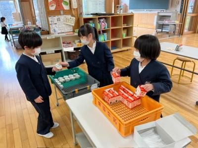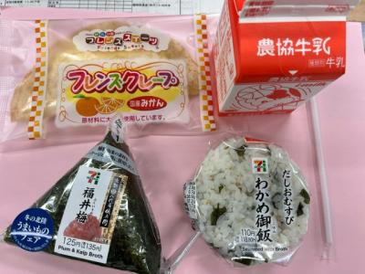 簡易昼食が始まりました。地震の影響で七尾市のほとんどの給食センターが破損しており、今までのような給食はまだ出すことができない状況です。今日はおにぎりと牛乳、デザートのクレープというメニューでした。