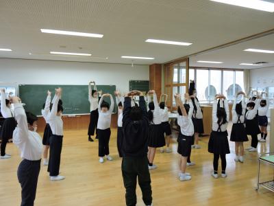 下の写真は3年生の体育です。狭いスペースでもできるストレッチや、2人組遊びで心と体をほぐしました。
