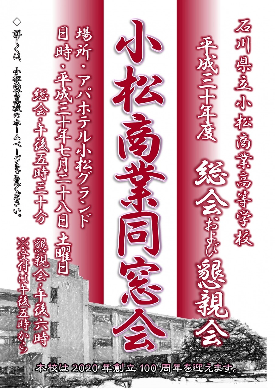 例年開催しております「小松商業同窓会総会」が下記の日程で行われます。たくさんの同窓生の皆さんの参加をお待ちしております。なお、詳細については各学年理事に案内させていただいておりますのでご確認ください。
