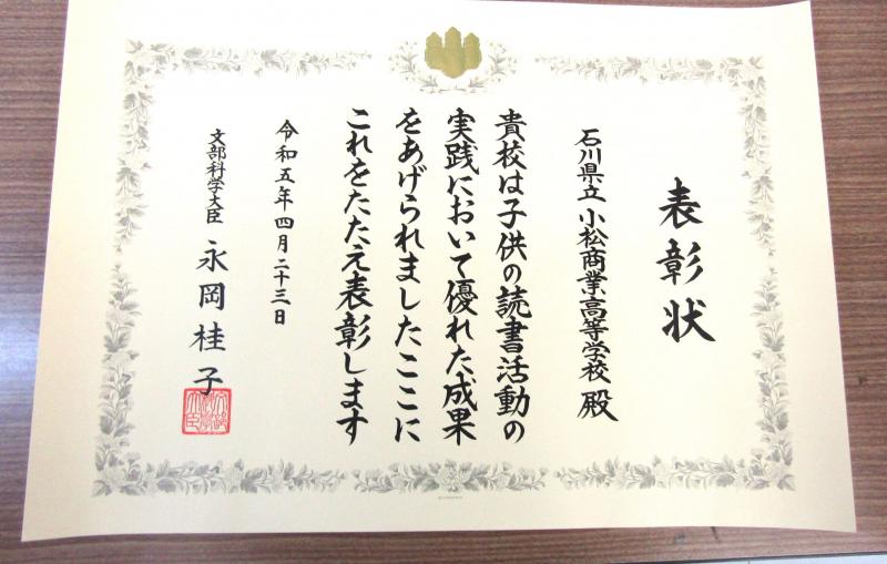 小松商業高校図書室の活動が認められ「子供の読書活動優秀実践校」の1校に選ばれました。
