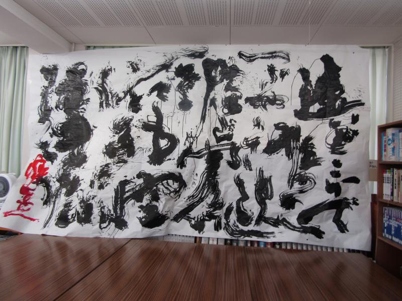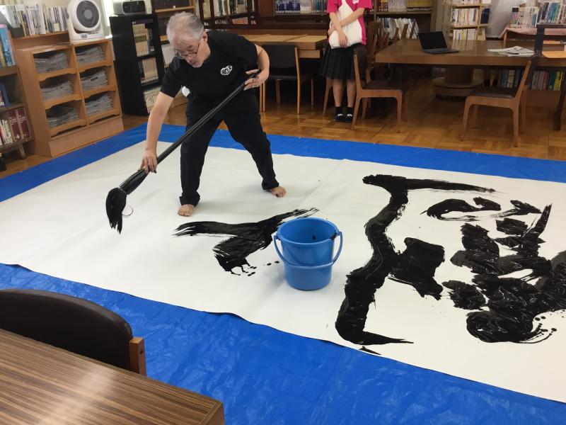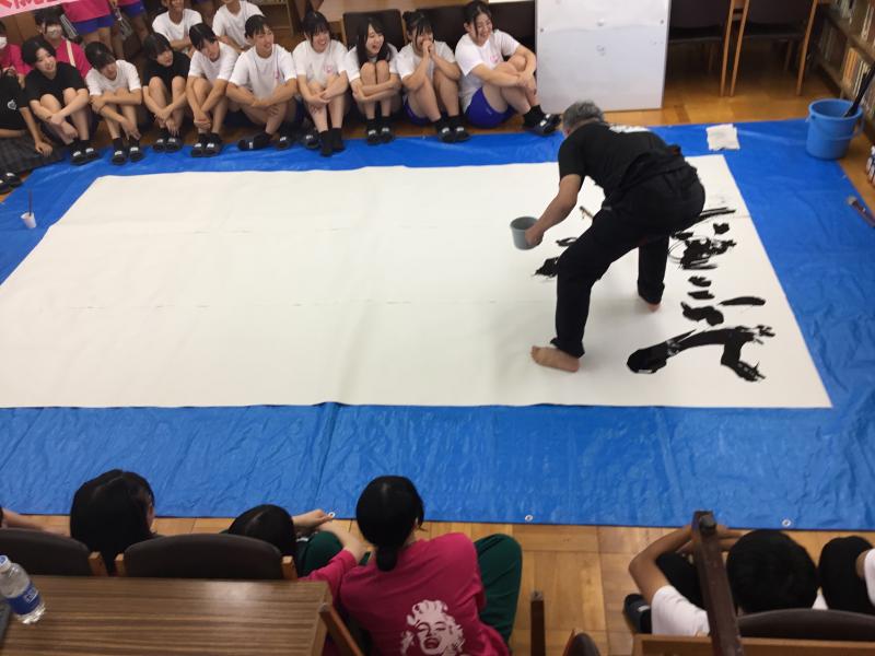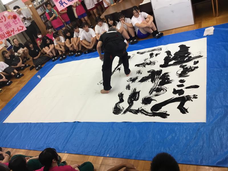 8月31日の文化祭で、下田先生が見事な書道パフォーマンスを披露してくださいました。2回合わせて約120人が、固唾を呑んで下田先生の大胆な筆さばきを見守りました。脱出ゲームも好評で、午前で景品が全てなくなりました。
