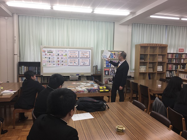 うつのみや書店の柴田様を講師に「日本で一番、POPを作られているところはドン・キホーテ」というお話から他中学校でのPOPリレーや他校のPOPを参考に作り方を丁寧に教えていただきました!