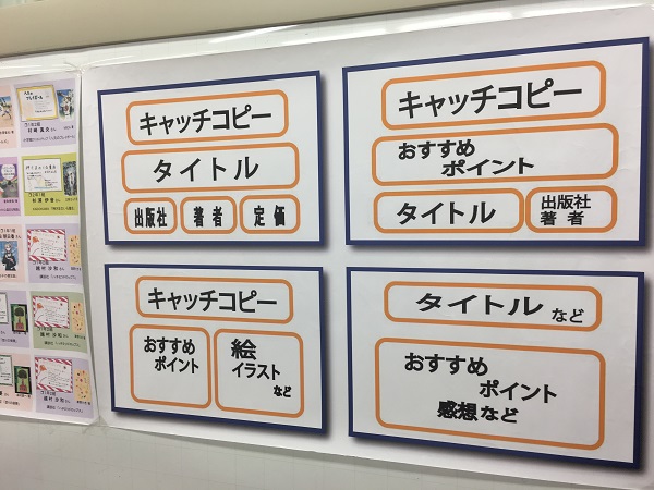 期末考査最終日、図書委員のPOP講座を行いました。POPとは広告用語で「お客様が購買するときに頼りにする案内役」の意味です。図書室の場合、POPでいかに本を借りたいと思わせられるか?ということ!
