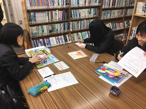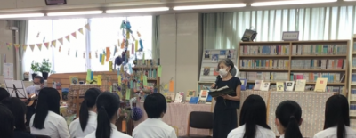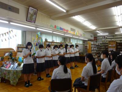 本校からは、18名が参加し、生徒会が作成した本校の紹介動画、大形絵本を使った読み聞かせ、本校の貸出ベスト10の本の紹介、ビブリオバトルチャンプの中山さんによる本の紹介が行われました。