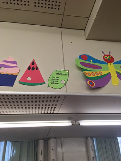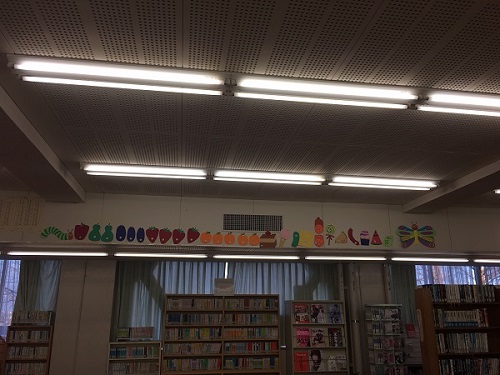 エリックカール作「はらぺこあおむし」をもとに、可愛らしい作品が図書室を彩っています。