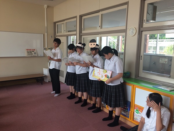 メンバーは1年生が4人、2年生が2人、3年生が2人で、読み聞かせは初めての生徒がほとんどでしたが、お面作りや練習に一生懸命取り組んでくれました。