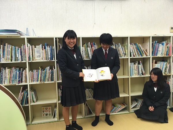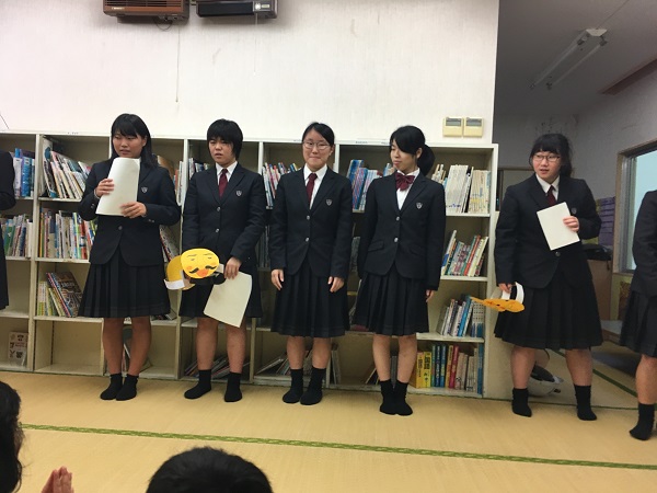 11月14日(火)16時から、図書委員が今年度2度目の絵本ライヴに行って来ました。メンバーは1年生が2人、3年生が6人で、小道具のお面をとても上手に作ってくれました。