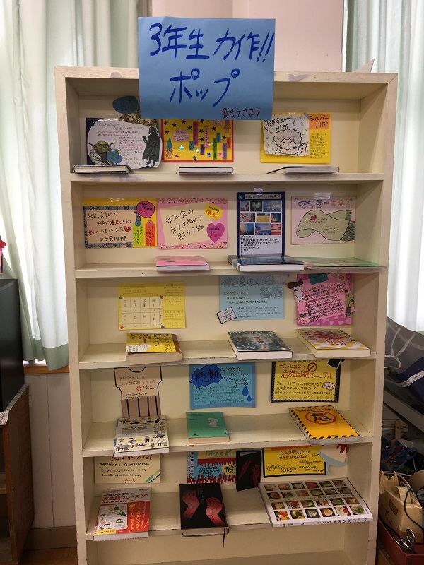 そして12月、国語の授業で3年生が作ったPOPを、ほんの一部ですが図書室に展示しています。随時、職員室前ホワイトボートにも飾る予定です。