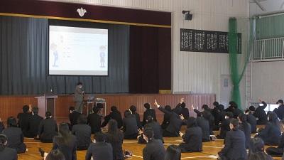 ※本日、卒業後の長期的な展望に立ったキャリア教育の一環として、講師に京塚様をお迎えし、3年生を対象に「社会人マナー講座」がおこなわれました。給料を貰ったら税金・保険などがかかり、使えるお金に限りが生じることや、18歳成年にともない契約が自己責任になってくることなど、たくさんの事ををお話しいただきました。後半には、契約や税金、保険、年金、ECなどについてクイズ形式でみんなで楽しく考えました。