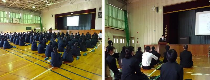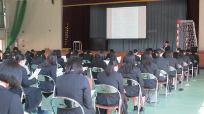 ※本日、小松警察署生活安全課の北川貴浩様、石川県教育委員会事務局学校指導課・生徒指導推進担当の本田淳也様にお越しいただき「非行防止教室」が行われました。SNS等による危険性や不良行為、いじめや命の大切さなどについて、お二方よりお話しいただきました。ようやく高校生活に慣れてきた1年生にとって、とっても有意義な講演会となりました。