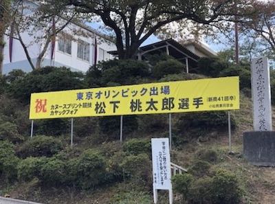 2019年11月6日 12時56分 来年の東京オリンピックカヌースプリント競技への出場が決まった、本校卒業生(新商41回卒)の松下桃太郎さんの健闘を祈念し、横断幕を設置しました。同窓会の皆様、有難うございました。