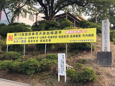 第74回国民体育大会に出場する選手の皆さんの健闘を期待し、横断幕を設置しました。本校からは、女子ハンドボール部の生徒6名とカヌー部の生徒2名が、それぞれの競技に出場します。茨城国体での活躍を期待しています。頑張れ!