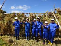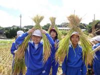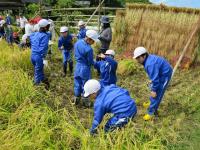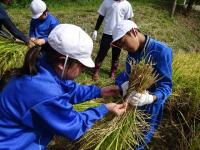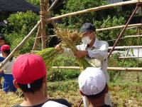 春に田植えをした田んぼで、秋の収穫体験をさせていただきました。