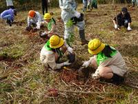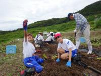 三井町の山林で植樹を行いました。その後、林業ボードゲームで、森林の大切さと保護・管理対策について、ゲームを通して学びました。
