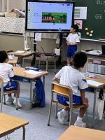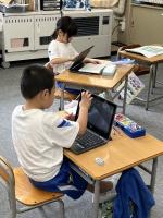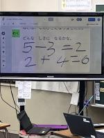 今日の学習は、3つの数の加減計算です。〈どんなしきになるかな〉という課題に対して、自分の考えをクロムブックに書きこみ、友達の考えと比べていました。前に出て発表したり、友達の考えを聞いたりしました。