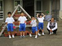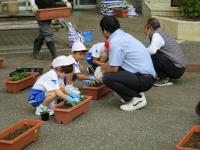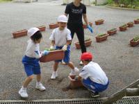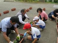 鵠巣公民館長さん、二人の主事さんといっしょに、プランターに花の苗を植えました。プランター、土、花の苗は全て公民館で準備してくださいました。子どもたちは、時間と共に、どんどん上手に植えることができるようになりました。