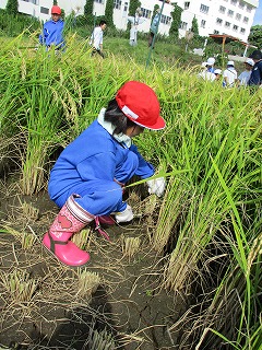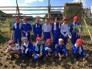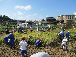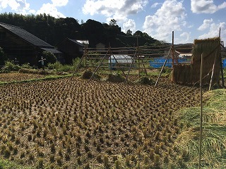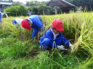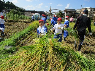天気の良い中、手際よく稲刈りをすることができました。最初は「あまり切れない」「(稲を)持つのが難しい」と言っていましたが、「一発で切れたら気持ちいい!」「どっちが速くできるか競争しよう!」等と楽しそうに作業していました。