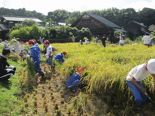 鵠巣小の3~6年生が、河井小学校の4年生と一緒に稲刈りをしてきました。