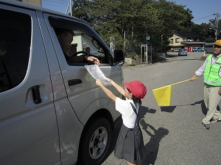 公民館の前で警察の方と公民館の方と一緒に、止まってくれた車に安全運転を呼びかけました。運転手さんたちに安全にすごしてほしいということで折り鶴やメッセージを全校で作っていました。