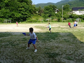 挟み撃ちの作戦を考えたり、逃げ回ったり、水鉄砲を二刀流で対抗したりと楽しそうに活動していました。