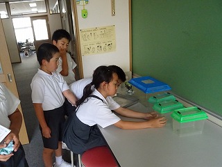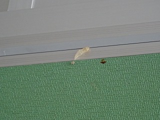3年生が理科で観察していたモンシロチョウが、いつの間にかサナギから蝶になっていました。サナギになるときに脱走して教室の上の方にサナギを作った幼虫もいました。