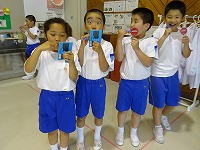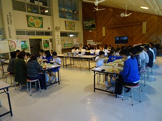給食後のはみがきの様子です。今年度からランチルームで全校一斉にしています。