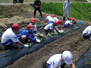 「苗がねているように植えるんだね」「土をかぶせよう!」と意気込んでいました。高学年が上手に低学年に教えてあげていました!