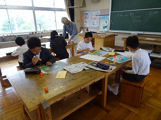 5・6年生が切り絵をしています。あじさいをモチーフに考えました。