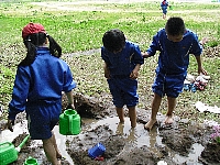 図工の時間に土遊びをしました。町を作ると意気込み、山や道、トンネルを掘り、水を流し込みました。子どもたちは無邪気に土の感触を楽しんでいました♪