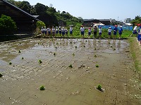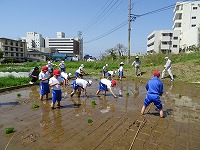 河井小4年生と一緒に、鵠巣小3・4・5・6年生が田植え体験をさせていただきました。あたたかく、よい天気の日にすることができてよかったですね。