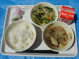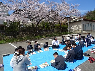 天気が良かったので、急遽お花見給食をしました。とってもいい天気できもちがよかったです。三色団子おいしかったです。