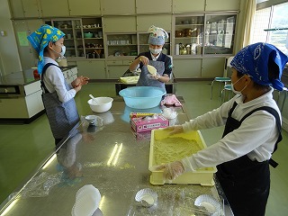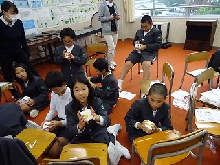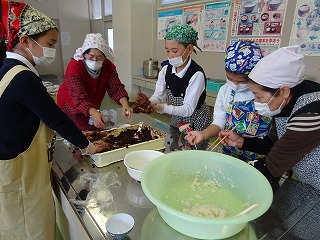 11月4日に1,2年生が学校の体験農園のお世話をして下さった方々をお招きして「おいもパーティー」を開きました。1時間目からさつまいもを調理し始めました。保護者や栄養士の方にも協力していただき,おいもパーティーの開始時間までに何とか作ることができました。