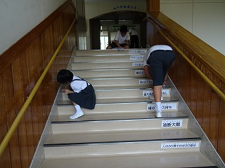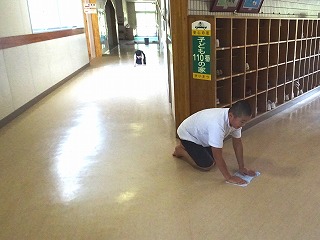 廊下と階段のワックスがけをするので、全校で水ぶきそうじをしました。