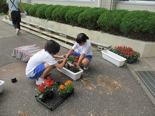 公民館からいただいた花を5・6年生がプランターに植えてくれました。