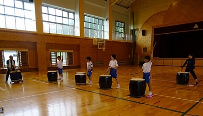5・6年生が、あじさい祭りで披露する高洲太鼓の練習に取り組んでいます。今年は、4人と少人数ですが、元気に練習に励んでいます。