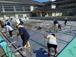 プール開きに向けて、掃除を実施しました。今年は、児童数の減少を受けて、保護者の力を借りて行いました。そのおかげで、短時間できれいになりました。ありがとうございました。