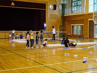 輪島市のスポーツ専門員の方が学校に来てくださり、放課後トランポリン教室が行われました。