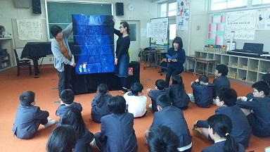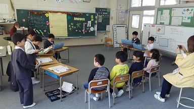 鵠巣保育園のひまわり組さんを招いて、新1年生迎える会を開きました。1・2年生が歓迎の歌や合奏、紙芝居を披露しました。また、仲良し遊びや校舎案内、プレゼント渡しもあり、楽しんでもらえたと思います。4月の入学を待っています。