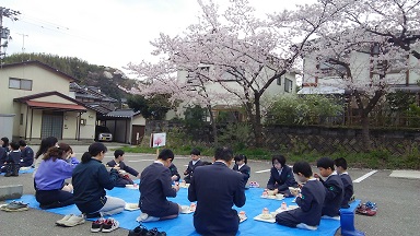 天候と行事で昨年はできなかった花見給食を8日実施しました。風が少し冷たかったですが、満開の桜の下での給食はまた格別でした。