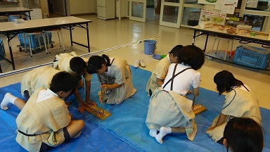 「縄文人の暮らしに学ぼう」と題した、埋蔵文化財センターの考古学出前講座がありました。担当者から、歴史や土器、石器などの説明を聞いた後、縄文人の衣装を身にまとい、石器を使ってのクルミを割りや火起しの体験をしました。縄文人の知恵に驚くことばかりでした。