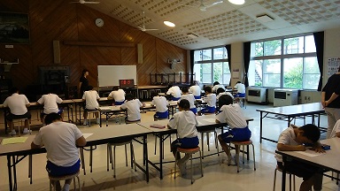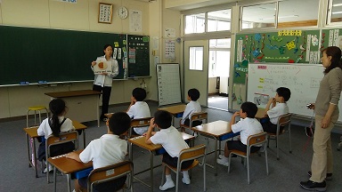 課外の活動として、1・2年生が外国語活動を行いました。ALTと一緒に、I like ~ について、楽しく勉強しました。