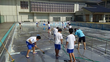 22日のプール開きにむけて、3~6年生で掃除に取り組みました。1年間の汚れは頑固で、手こずりましたが、みんなの力で綺麗になりました。