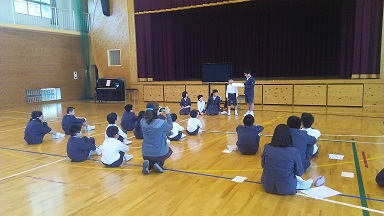 4限目の全校集会に、「1年生を迎える会」を実施しました。上級生から、1年生の紹介があった後、縦割り班に分かれ、クイズやゲームをして交流を深めました。