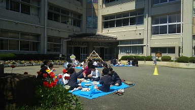 満開の桜の下で行うはずの「花見給食」が、天候に恵まれず、のびのびとなった23日に行われました。玄関には、チューリップとパンジーが花盛りで、ちょっと変わった花見給食となりました。