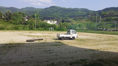 2015年5月7日 15時53分壊れて動かなくなった1号に代わり、グラウンドの整備のためにやってきた新しいトラック・・・「草刈り2号」。早速、タイヤを引いて、グラウンド整備に活躍しています。(ドライバーは、教頭先生です。)
