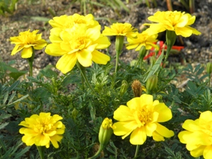 校門前の花壇にバッタがたくさんいます。