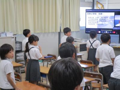 始業式では河井・大屋・鳳至・鵠巣・河原田・三井小学校の校歌を歌い、校長先生のお話を聞きました。オンラインでの始業式でしたが、姿勢よく参加する姿から、1人ひとりがそれぞれに2学期の目標を心の中にもって登校してきたことが伝わりました。