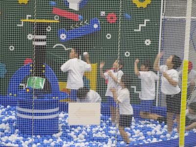 室内には、体を動かしたくなるアスレチックコーナーがたくさんあって…。