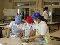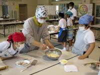 大野町の萩原さんを講師に、「やきつけ」というお菓子を作りました。縦割りの3グループに分かれて、協力しながら、粉を混ぜたりホットプレートで焼いたりしました。