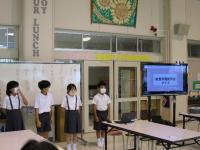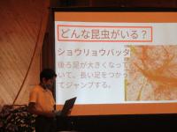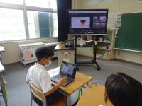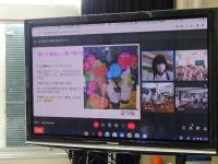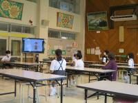 児童一人一人が、自分の決めたテーマについて調べたことをプレゼンにまとめて発表し、それに対して、二校の子どもたちが質問や感想を言い合いました。自校にはない他校の珍しい行事の紹介など、興味深く聴くことができました。